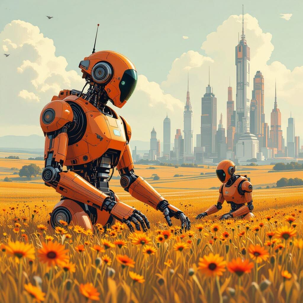 This image showcases soft-chrome robots tending fields in a gentle, utopian cityscape. It features vintage future tech with a dominant orange color palette, presented in a retro-futuristic style.