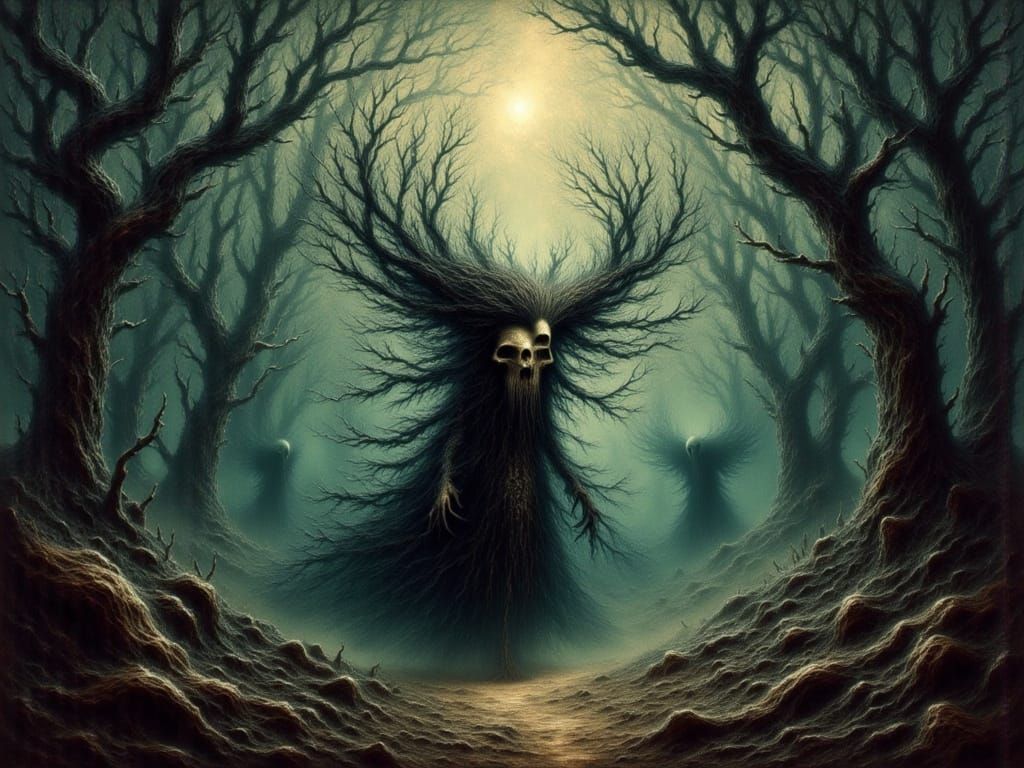 This image shows a surreal forest spirit with skull-like features, evoking a sense of magic and horror. The artwork has a gothic, grunge aesthetic achieved through digital painting techniques.