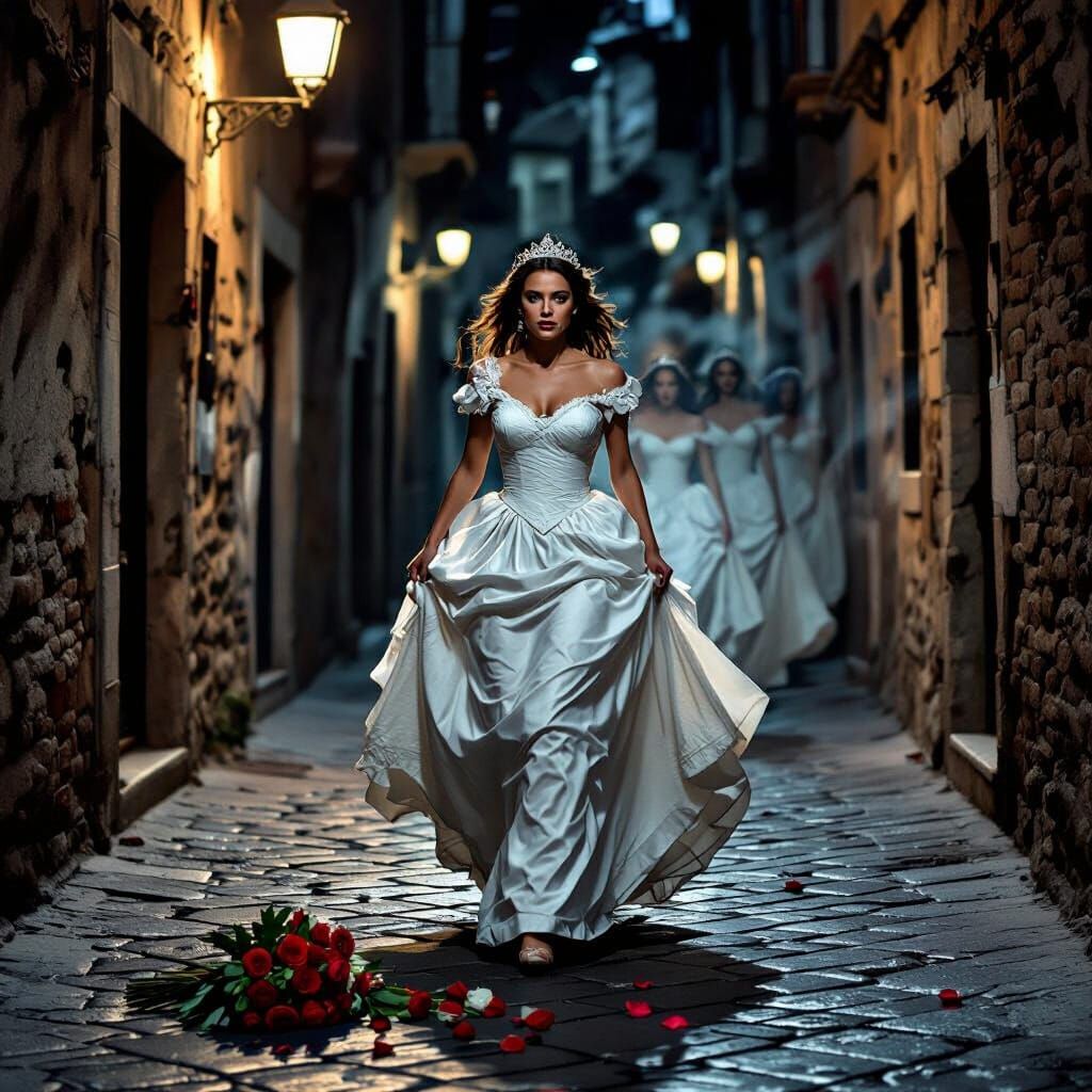 This image shows a distressed bride in a white gown running through a dark Neapolitan street. A broken tiara and wilting roses are left behind. The scene features a haunting, distorted visual effect with a brooding color palette and dramatic lighting.