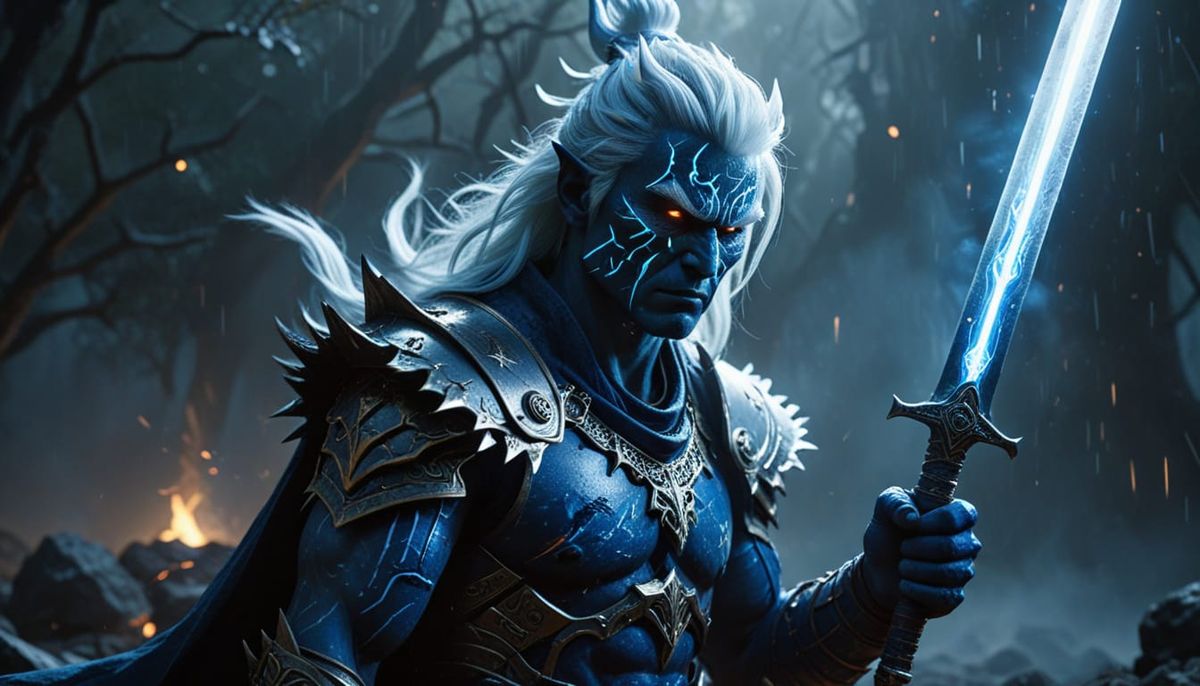 A cinematic image depicts an Oni warrior holding a glowing Excalibur. The scene features spiky white hair, mystic mist, and bold shadows in a dark fantasy setting, reminiscent of Akira Kurosawa's style.