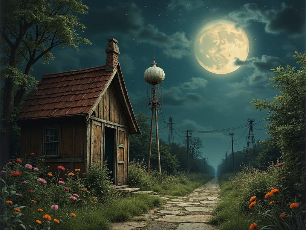creepy fantasy creepy garden 3D stumpwork Agnolo Bronzino Hector Guimard Hieronymus Bosch semi-living things peer out of nooks and crannies and rusty windy whirlingtons no longer spin the garden shed collapsed years ago under the weight of unfulfilled expectations in the distance a skeletal haha hedge ...