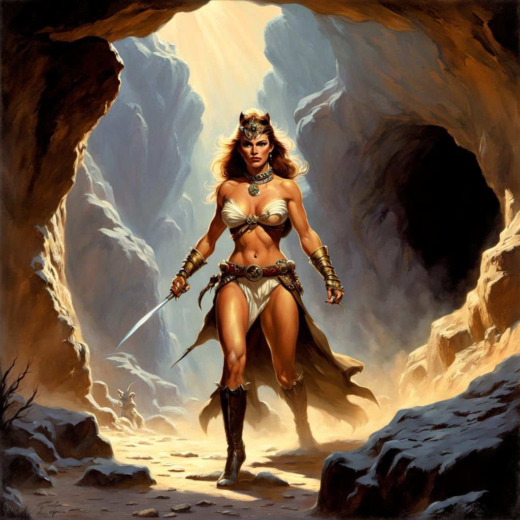 This fantasy concept art depicts a fierce cougar princess in regal attire, emerging protectively from an ancient stone cave. Digital painting with dramatic lighting and intricate detail.