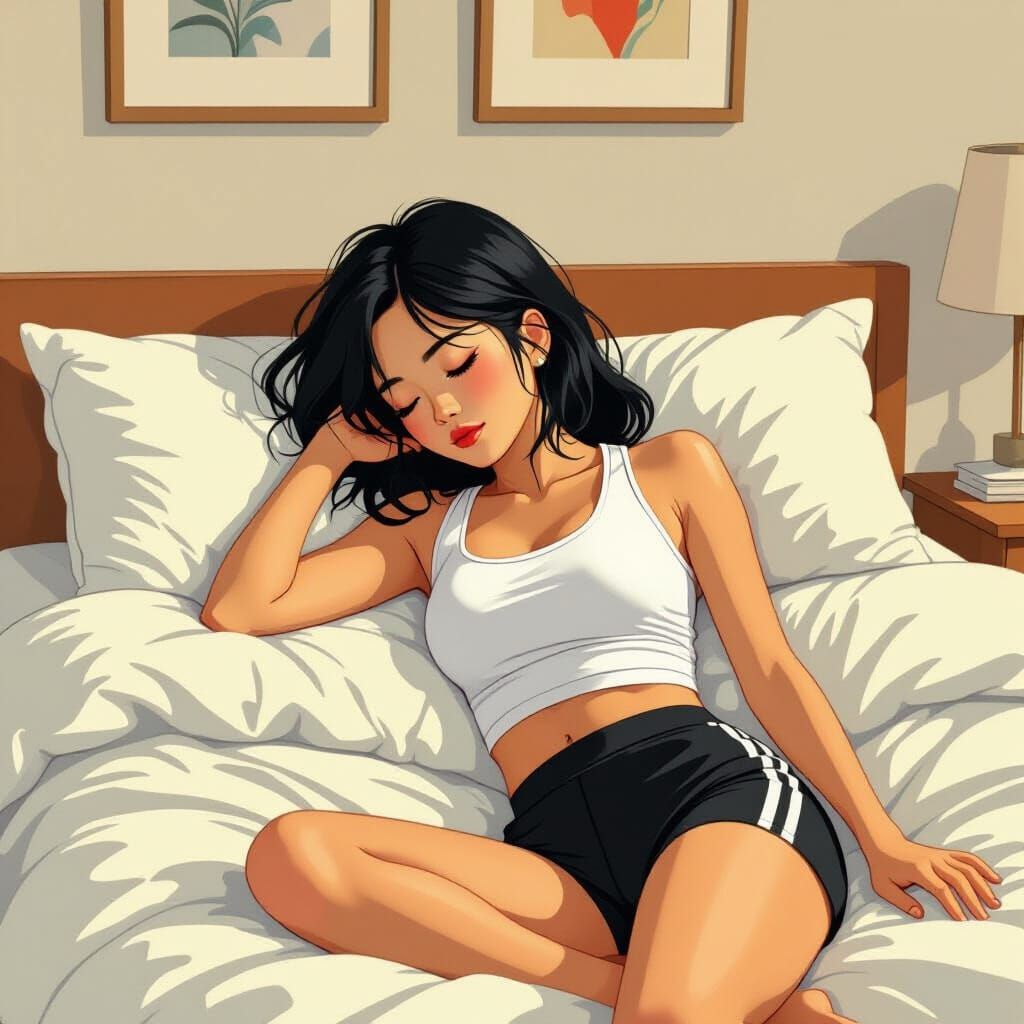 A peaceful image of a young Asian woman napping in her bedroom. The room is tidy and decorated with minimalist decor, with warm lighting and sleek lines in a contemporary style.