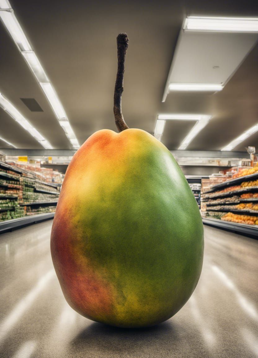 This image shows a huge mango sitting inside a supermarket. The hyperrealistic image features intricate details, sharp focus, and a cinematic, moody atmosphere.