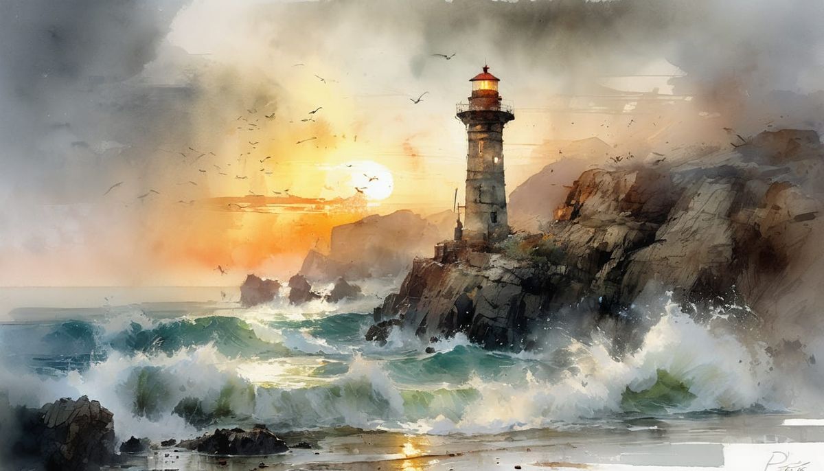 This image shows a detailed watercolor painting of an old stone lighthouse on a rocky coast during a dramatic sunset. Features rough paint strokes and textures, evoking fine art.