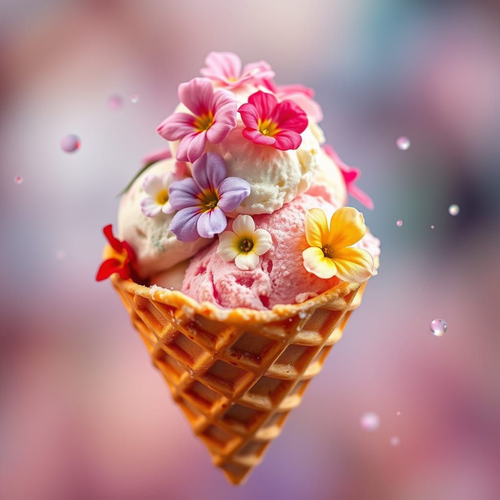 A super-realistic watercolor detailed painting taken with a Fujifilm camera at f/8 and an ISO range of 20 to 450, depicting a waffle cone filled with ice cream scoops decorated with flowers, composed in mid-air, creating a visually appealing composition that highlights both the frosty texture of the ...