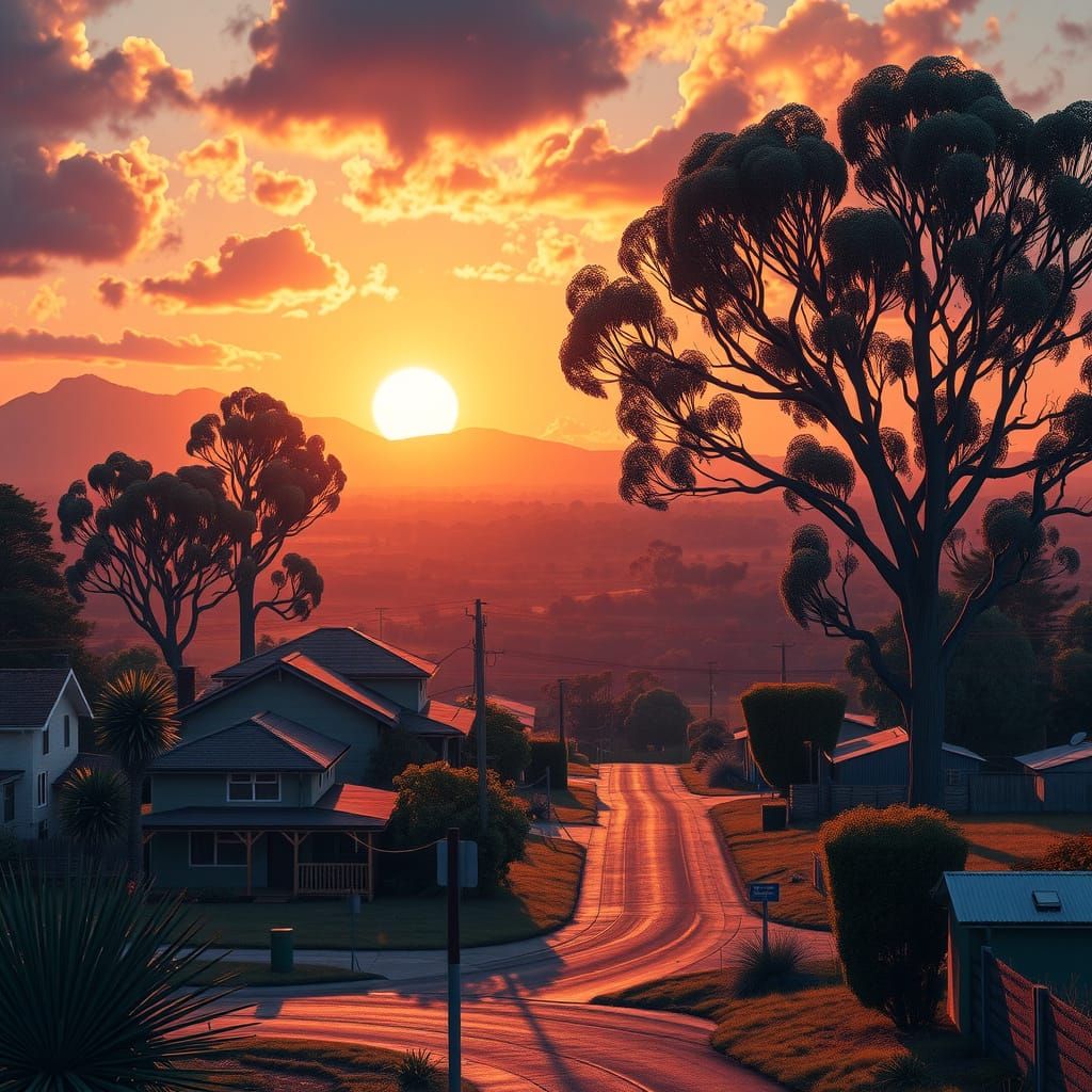 This image shows a vibrant Australian landscape featuring nostalgic suburban homes and eucalyptus trees bathed in a warm sunset with deep blues and purples. The artwork is reminiscent of fantasy concept art.