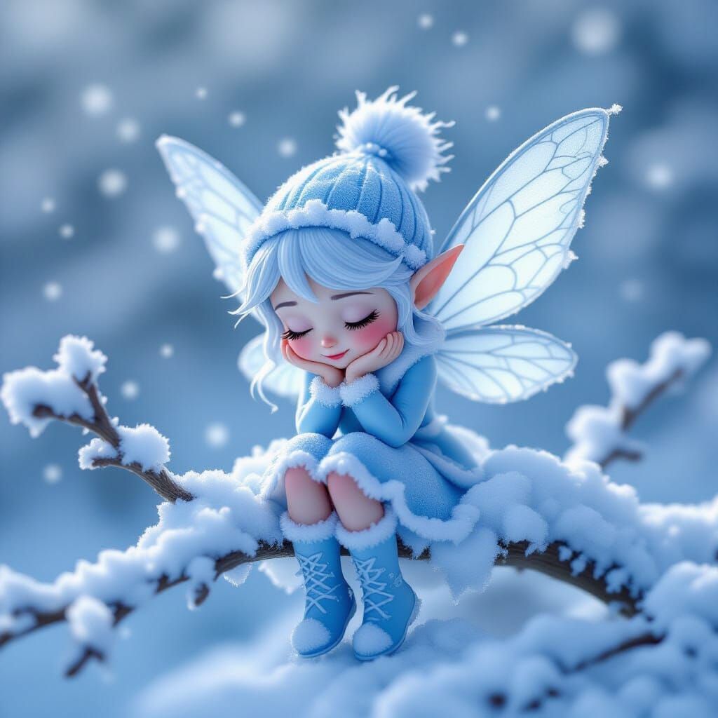 This image shows a sweet snow fairy in ice blue attire resting on a snow-covered branch. It is rendered in a soft, dreamy 3D digital art style with delicate lighting.
