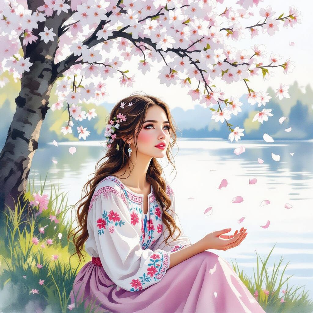 This watercolor painting captures a wistful Ukrainian woman by a lake under a white blooming tree. Her open gaze and delicate pose evoke a poetic, dreamlike mood in the evening light.