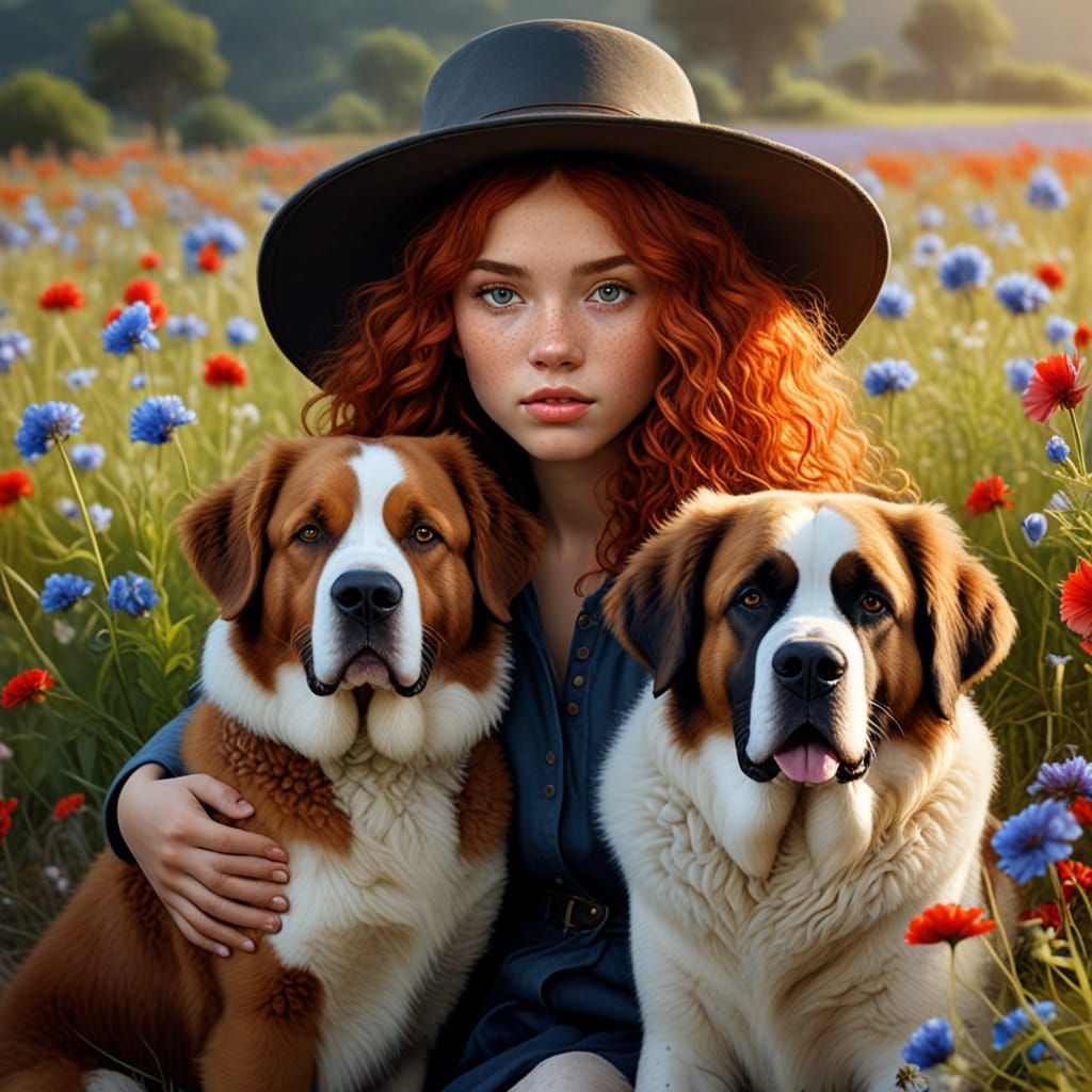 This image shows a close-up portrait of a red-haired girl in a field of flowers, sitting with a St Bernard. Soft, warm light illuminates her face in this highly detailed photograph.