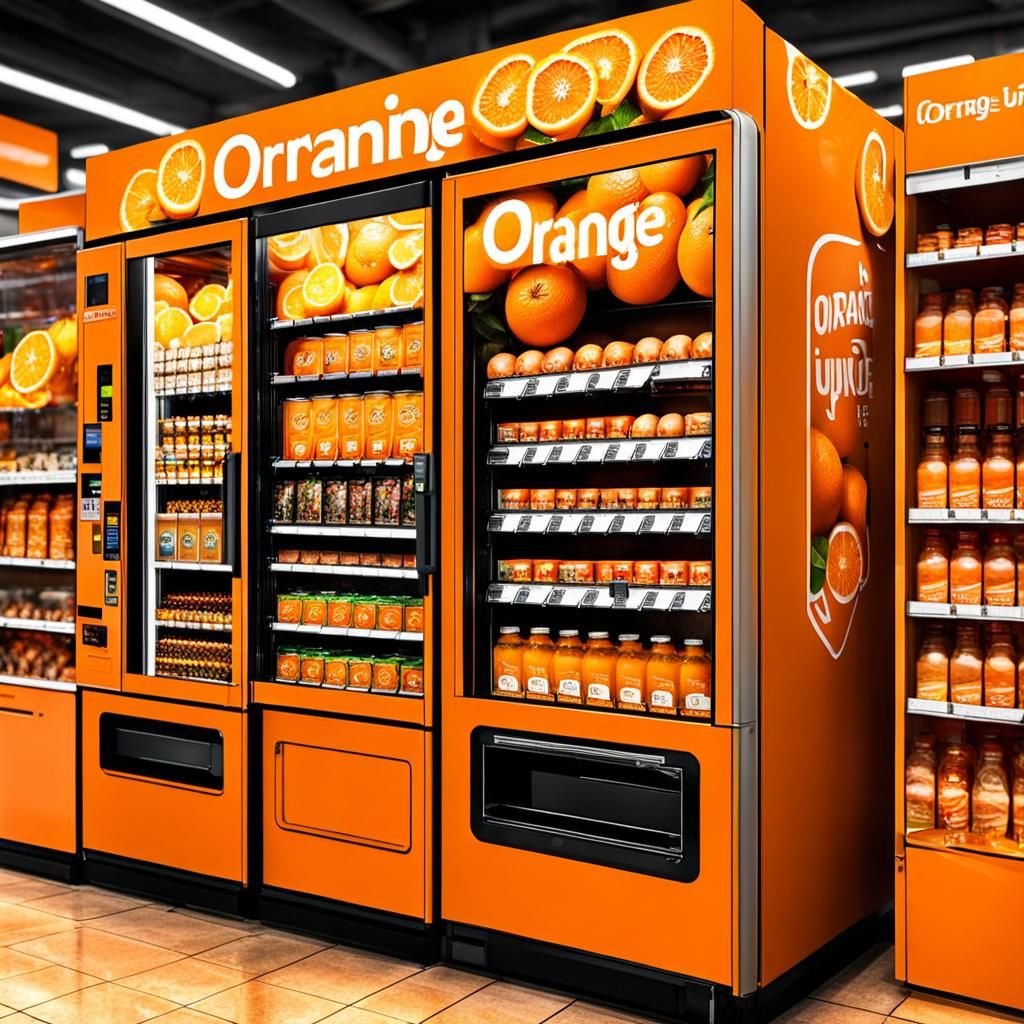 A hyperrealistic image of an orange vending machine filled with orange juice inside a supermarket. The high-contrast, detailed image uses a cinematic style to create an atmospheric mood.