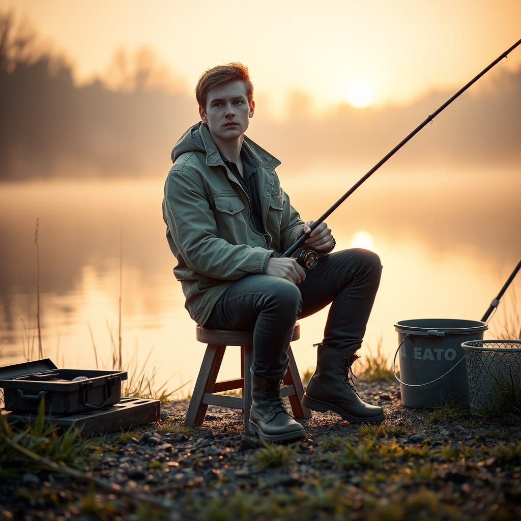 A young man sitting quietly by a river at dawn, fishing and gazing thoughtfully at the water. The soft golden light of the sunrise reflects on the calm surface of the river. He wears a light jacket and boots, and sits on a small stool near the riverbank, surrounded by detailed fishing gear: rod, tackle box, bait, and a bucket. The mood is peaceful and introspective. Realistic style, high detail, natural textures like wet grass, glistening water, mist in the air, and gentle ripples in the river. Emphasis on light, mood, and realistic fishing equipment.