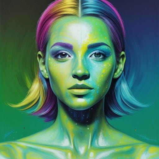 This image is a digitally rendered, hyperrealistic oil painting of a person's mid-body. It features a 2/3 face angle with warm shadows, visible brushstrokes, and vibrant neon colors.