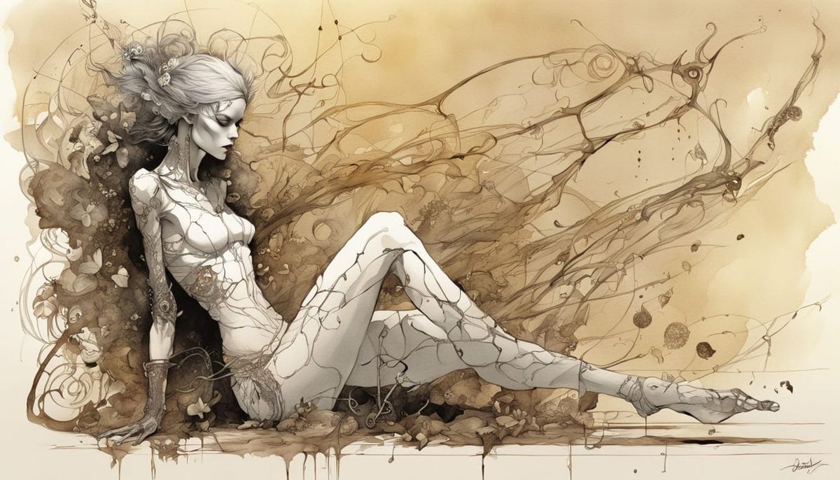 This image features a half-vegetal faery, half-pin-up character with perfect anatomy, rendered in bold lines and strong colors with ruby, diamond, sepia, and gold accents.