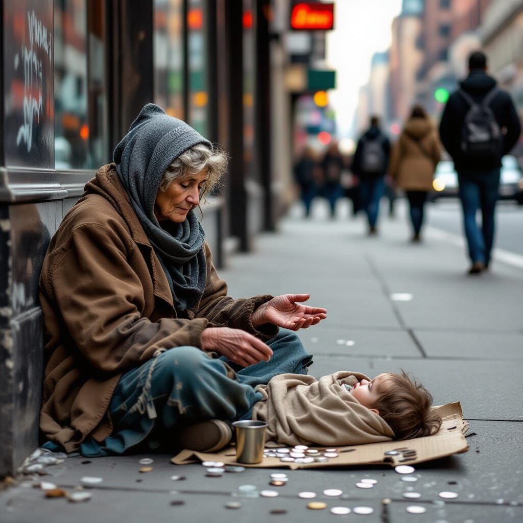 This image shows a homeless woman begging on a city sidewalk with her child. The picture is rendered in muted, earthy tones with rough, gritty textures, capturing a moment of urban destitution.