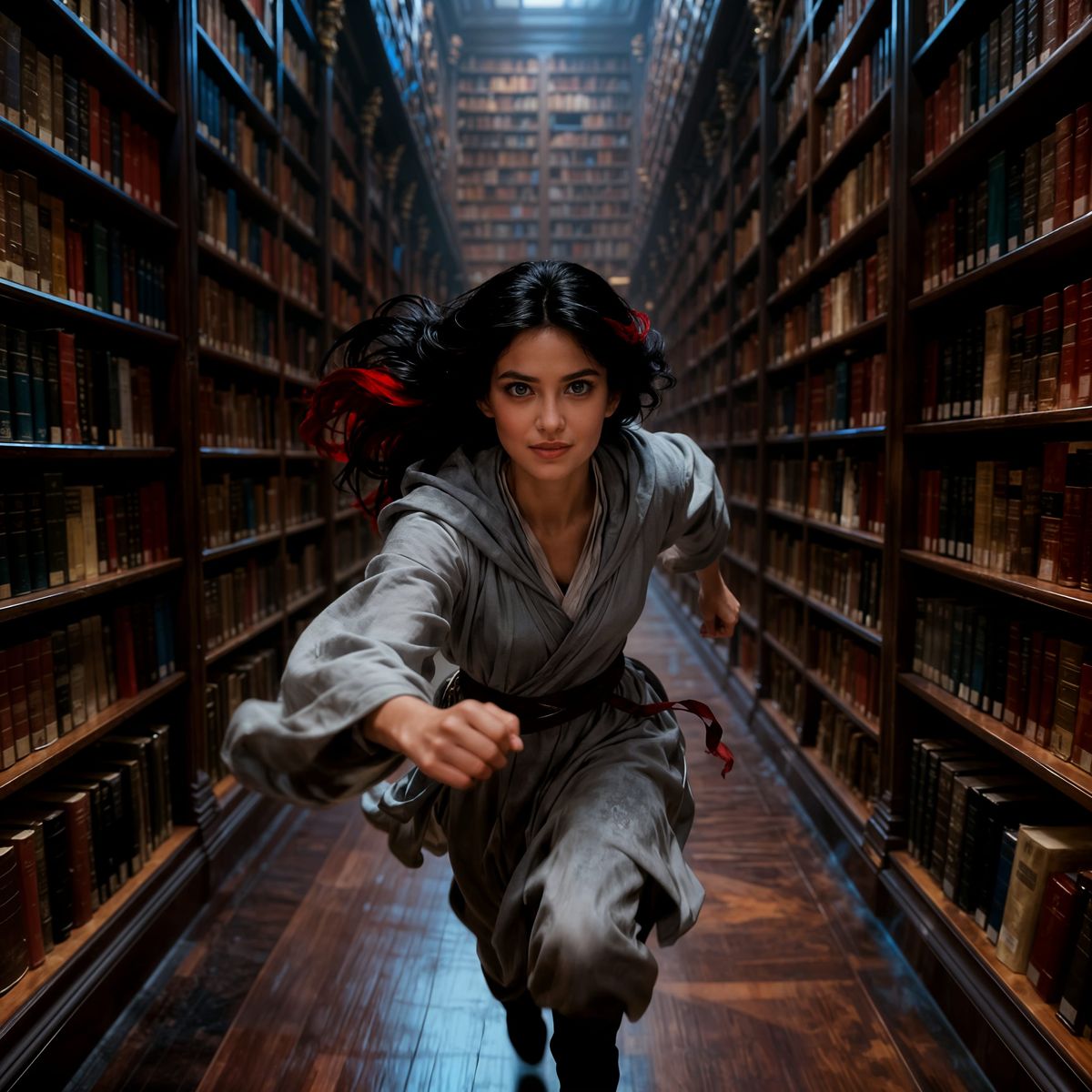 Beautiful young woman with an open face, strong featured, dark eyes full of intelligence and mischief, lustrous black hair with flashes of crimson. She is wearing light grey robes, rushing down a massive endless library aisle. detailed matte painting, deep color, fantastical, intricate detail, splash ...