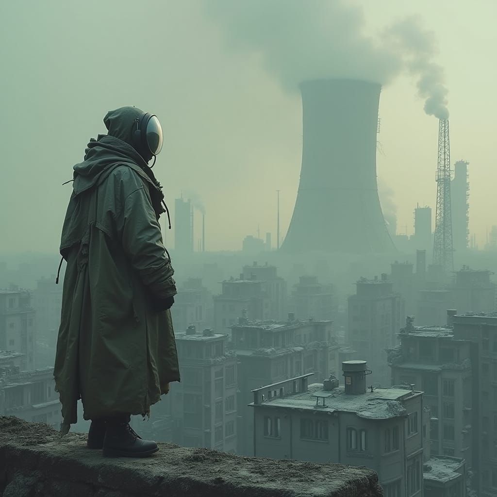 A lone figure stands at the edge of a cliff, gazing down at a desolate, post-apocalyptic cityscape. The once-great buildings are now rubble and ash, with smoke columns rising into a dark, grey sky. A faint, eerie light filters through the toxic haze, casting long shadows across the ruins.