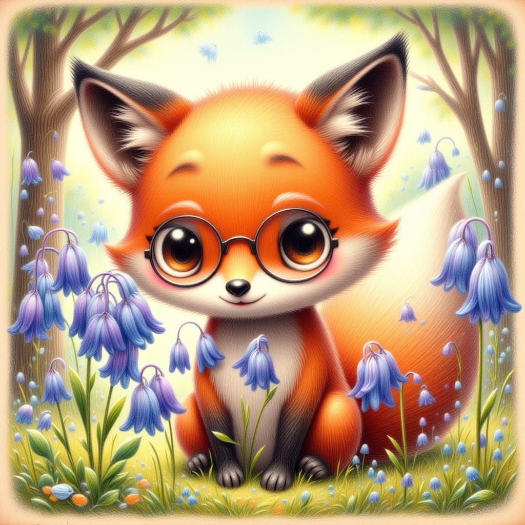 A charming AI image in a loose crayon style depicts a happy red fox with large eyes wearing glasses, smelling a bluebell. Soft lighting and a blurry forest background enhance the whimsical feel.