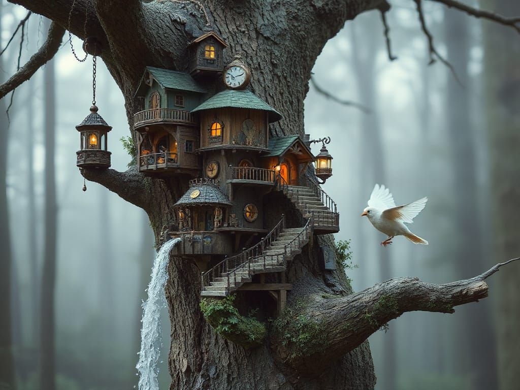 A striking picture of an elaborate steampunk birdhouse village clinging to a tree trunk. The multi-tiered village features waterfalls, bridges, cogs, and other intricate details, with a fantasy aesthetic.