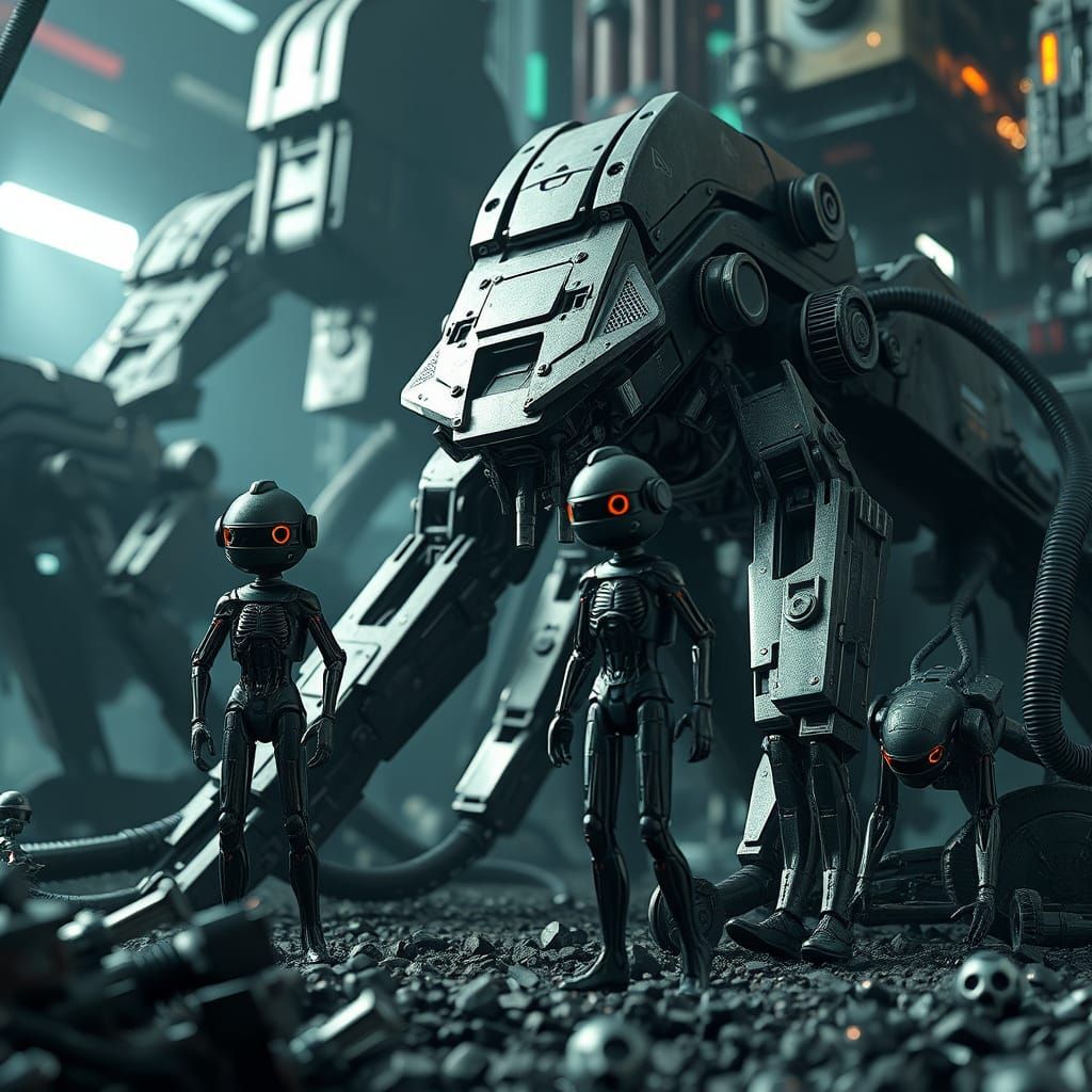 This image shows stick figures dwarfed by giant mechs. The scene is rendered with high detail and polished metal textures, creating a cinematic science fiction aesthetic.