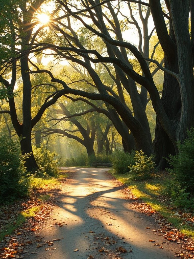This image depicts a tranquil forest path bathed in soft, golden sunlight filtering through ancient oak trees. Fragile green and gold leaves cover the ground, creating a serene and contemplative atmosphere.