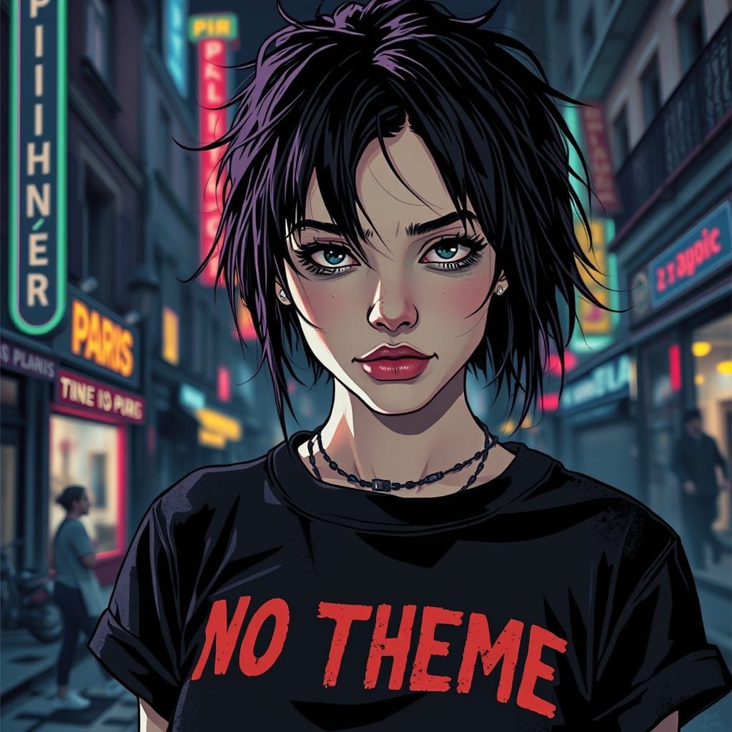 This image depicts a teenage French girl with a rebellious gaze, set against a dystopian cyberpunk backdrop of neon-lit Parisian streets. Her dark hair is styled in a messy, avant-garde manner, with bold, graffiti-inspired makeup. Blending the intricate line work of lithographs with psychedelic, spiritua...