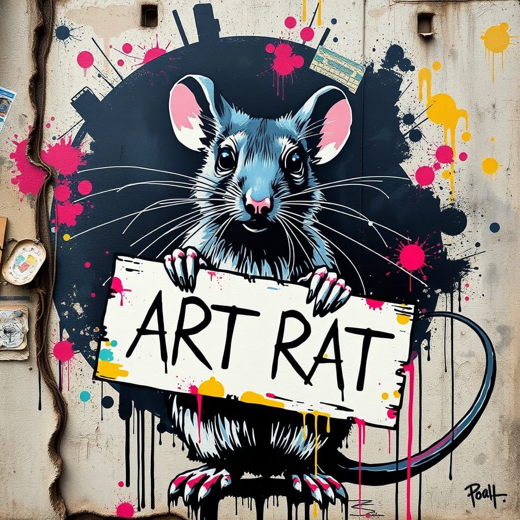 A vibrant graffiti artwork of a rat holding an "ART RAT" sign on a weathered wall. The piece features a high-contrast, polychromatic stencil style reminiscent of street art.