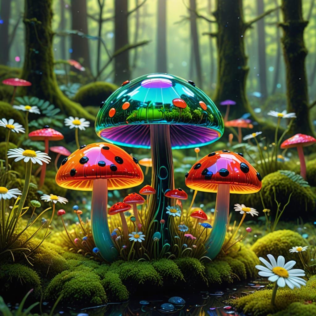 A striking picture of a neon mushroom in a miniature forest. The digital art features iridescent, glowing glass, ladybugs, moss, and daisies in pastel triadic colors. The 3D rendering conveys a dreamlike surrealism.