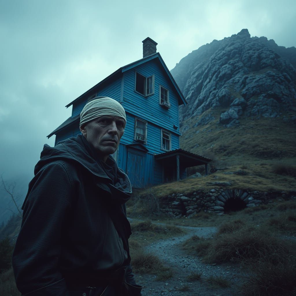 A lone, injured traveler pauses before a decaying blue house on a desolate hill. The scene evokes a dark, mystical aesthetic with ominous and fantastical undertones, reminiscent of digital fantasy art.