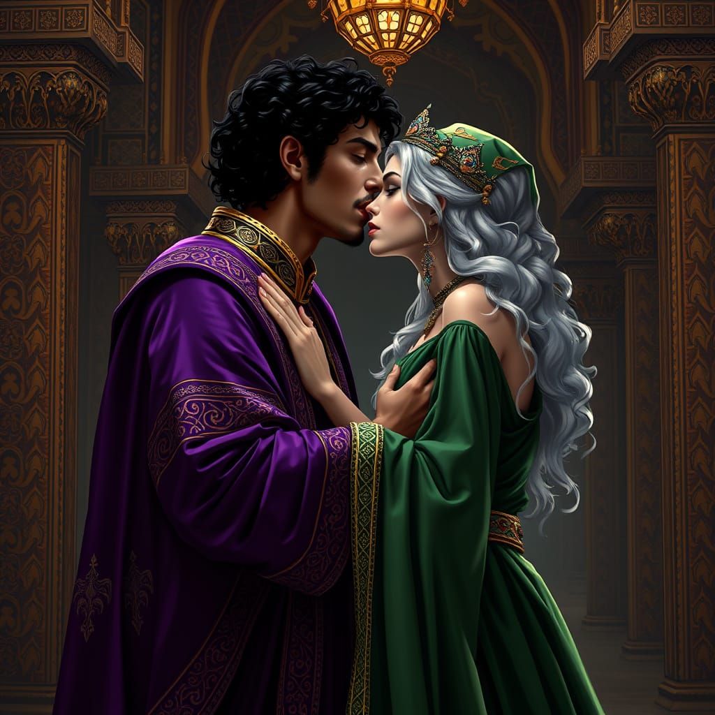 A dramatic image of an Arabian king kissing his magician councilor in a dimly lit palace hall. The scene evokes Ottoman opulence and is rendered with intricate Moorish patterns and dramatic chiaroscuro.