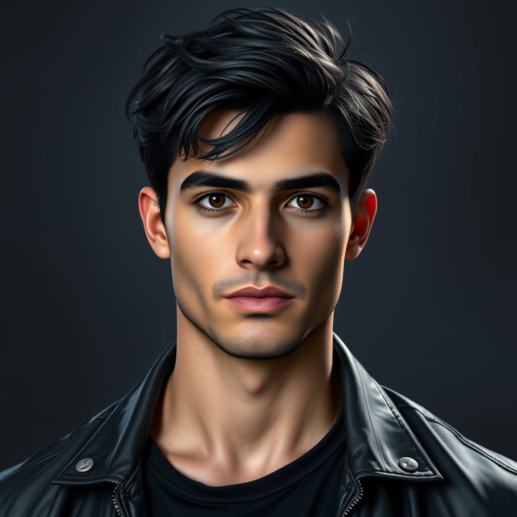 This hyperdetailed concept art captures a young Iranian man with dark eyes and tousled hair, exuding a regal aura. Rendered with dynamic lighting and bold colors.