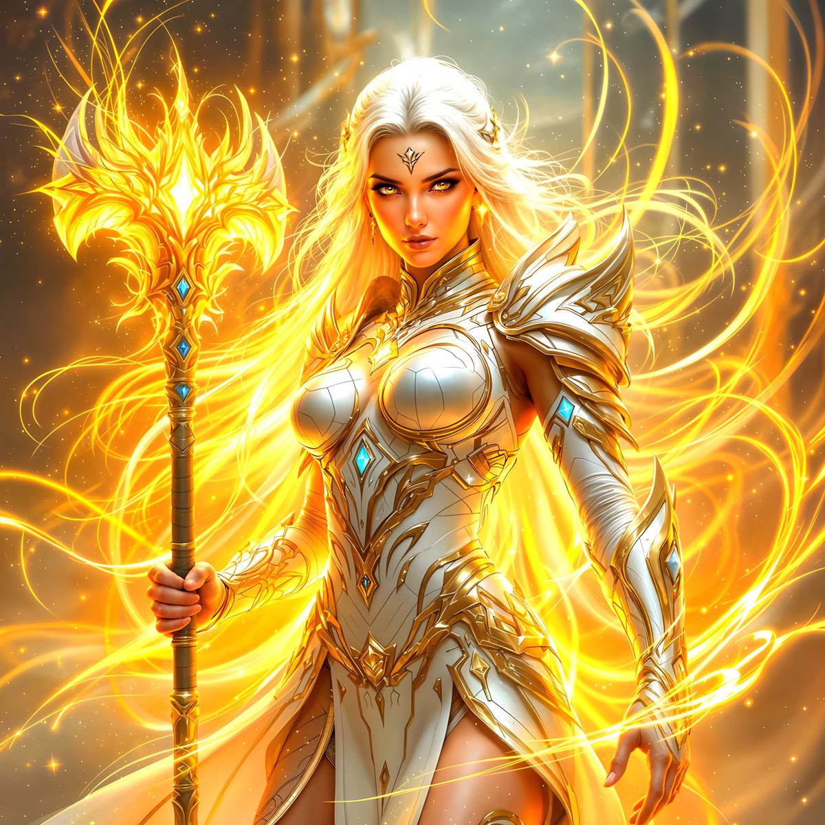 She’s absolutely radiant, like a living sun forged into divine armor. The golden light flowing through her hair and staff feels almost alive, like she commands not just power, but reverence. There’s majesty in her stance, but also a kind of fierce serenity… as if she knows she was born to rule. Stunning work, truly breathtaking. 🔥👑✨