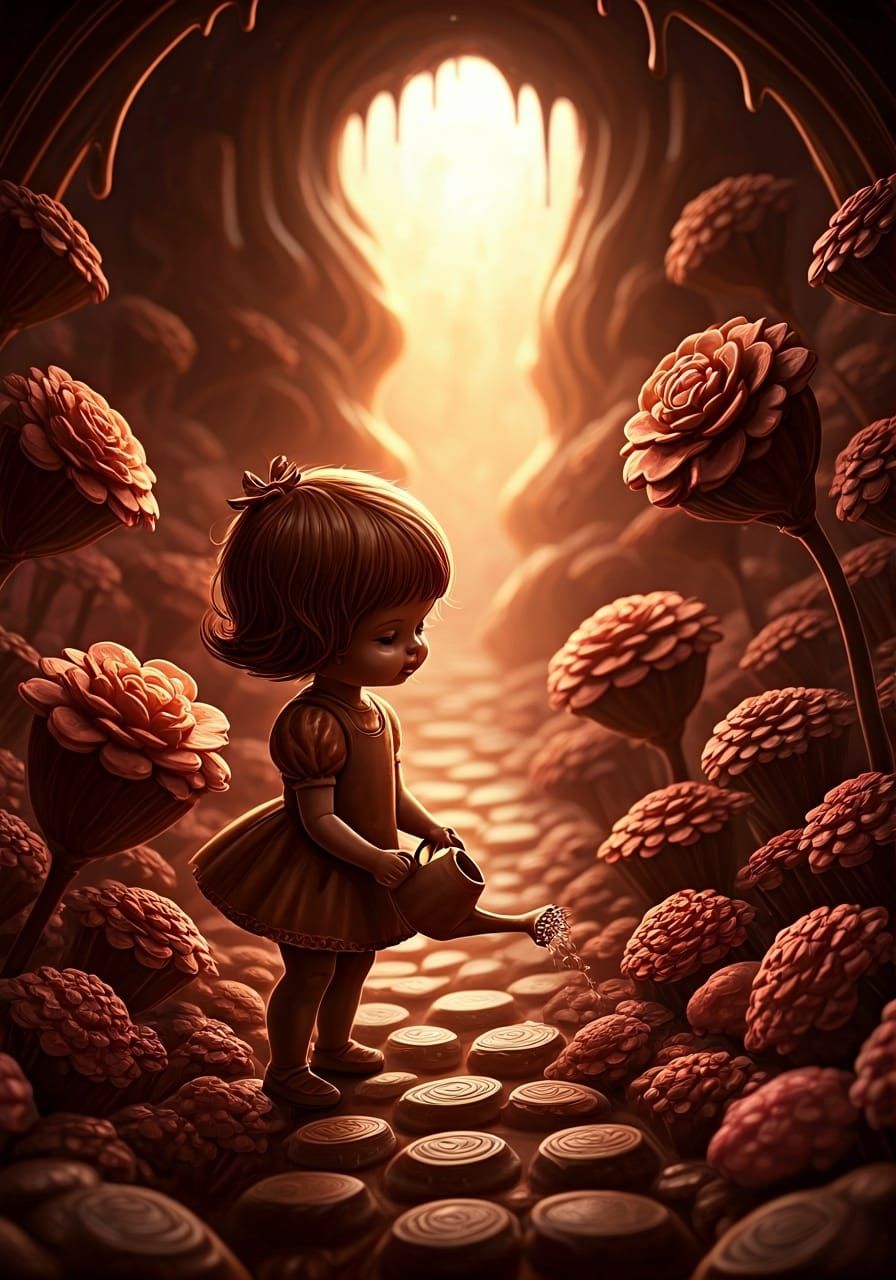 This image shows a cute little girl made of chocolate tending to her chocolate flower garden. The scene is rendered in various shades of chocolate, creating a delicious and whimsical world.