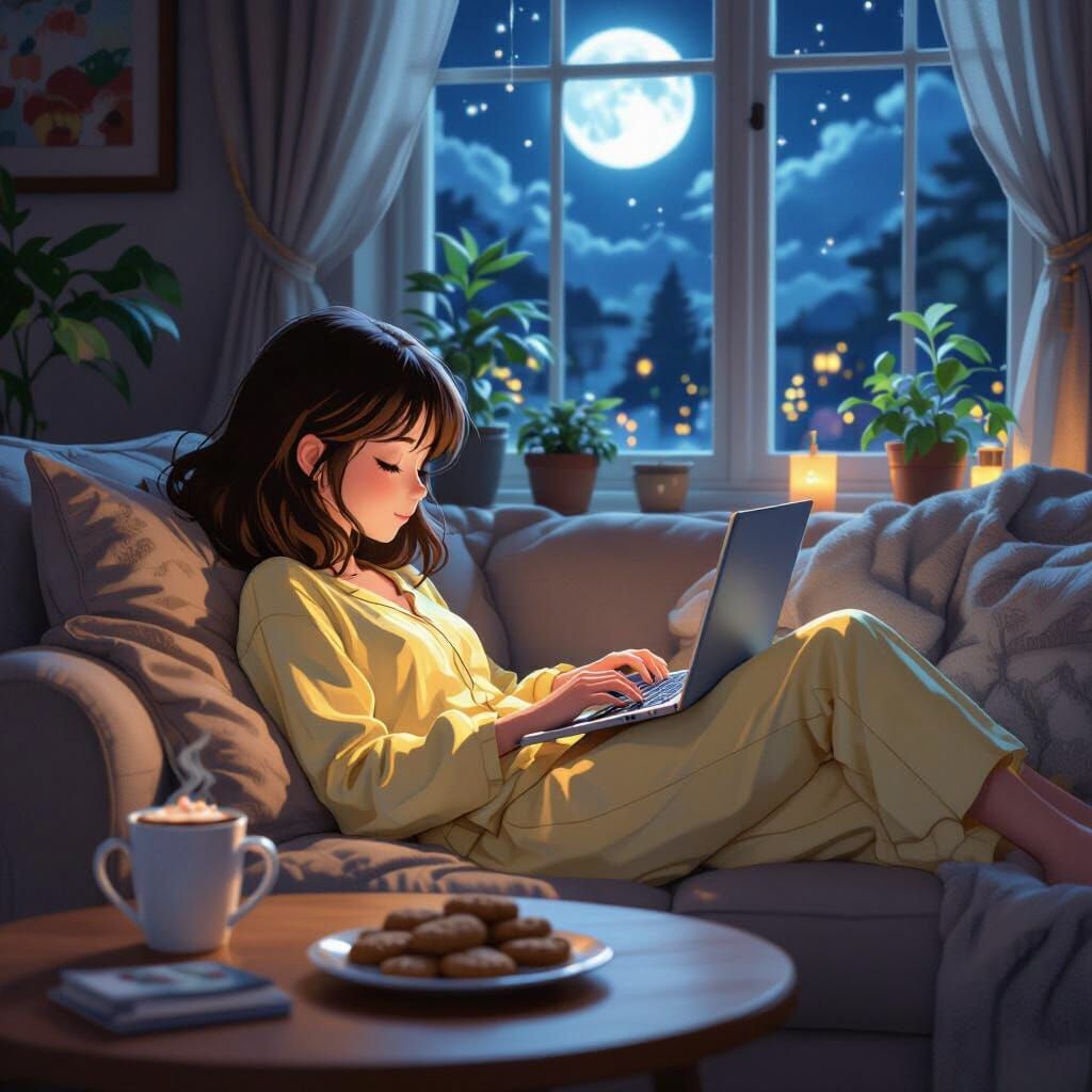 This image depicts a tranquil room filled with warmth. A girl types on her laptop near a coffee table with cocoa and cookies, bathed in soft moonlight and lamp light. Features a cat, books, and art supplies.