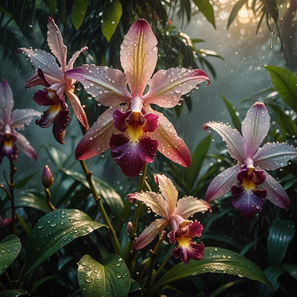 This image captures a stunning, macro-photographed orchid flower in a mystical, misty jungle, with raindrops glistening on its petals, set against a vibrant, high-contrast backdrop of warm, golden light and subtle particle effects.