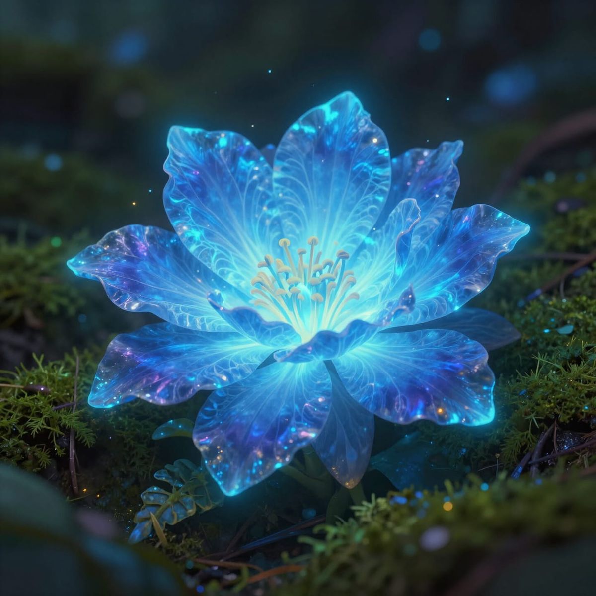 This image features a beautiful, ethereal glowing blue flower with intricate, delicate petals and iridescent textures. It rests on a dark, mossy surface, illuminated by its own magical aura with a soft bokeh effect, creating a dreamy fantasy art atmosphere.