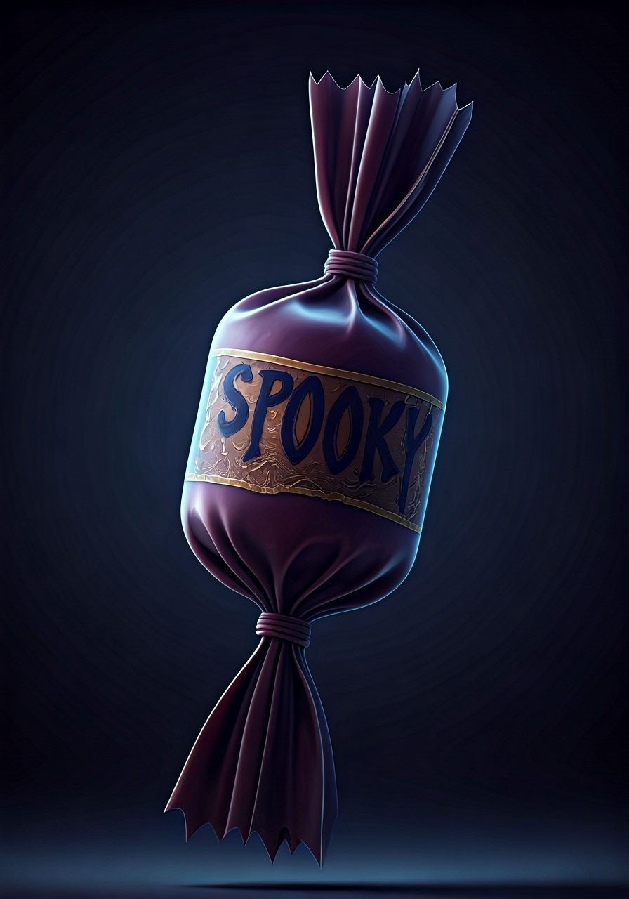 This image showcases a cartoonish, spooky candy wrapper design. Created with a 3D digital art style, it features cinematic lighting and post-processing for a polished look.