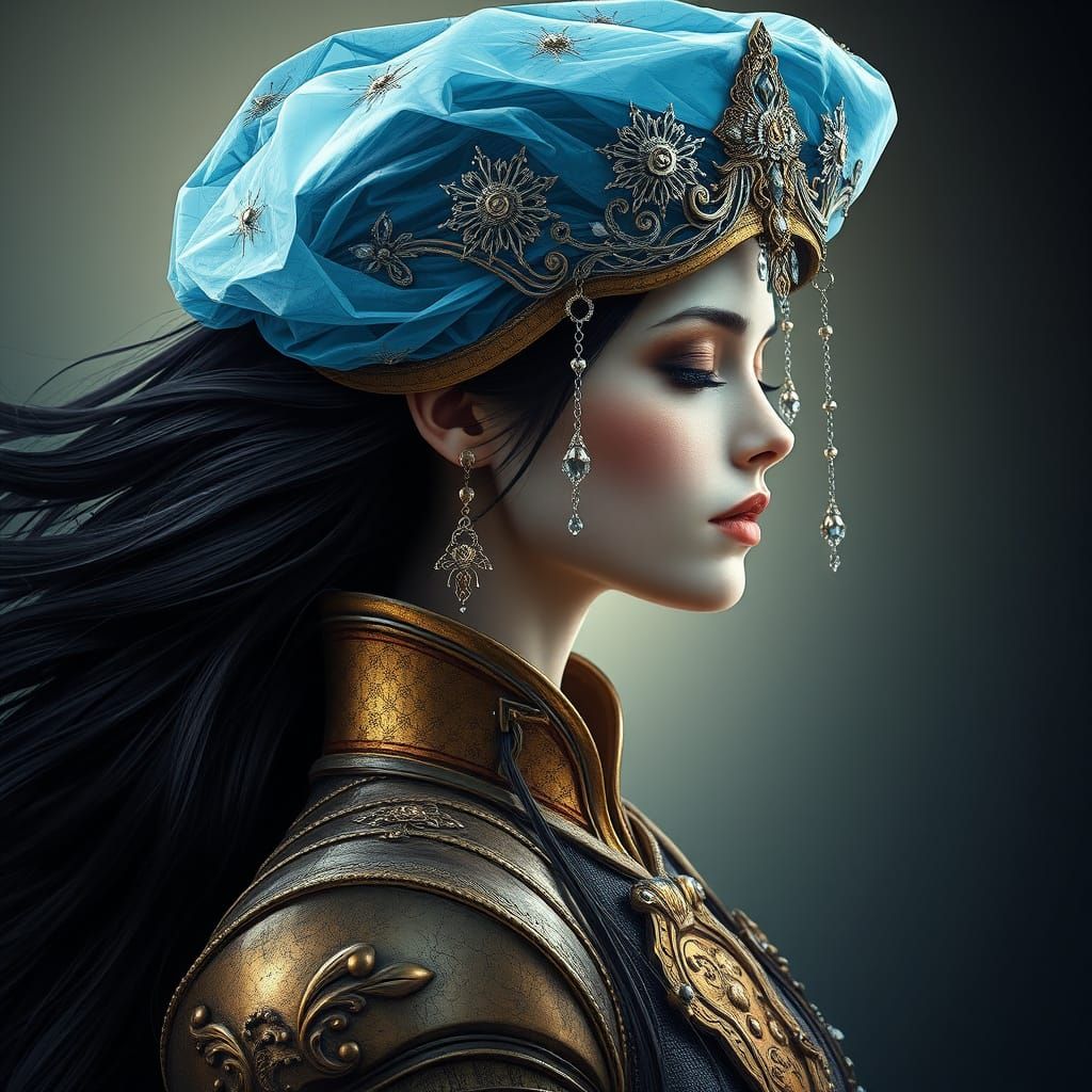 This image shows a serene, otherworldly woman in intricately crafted gold armor, wearing a majestic transparent blue hat with delicate silver filigree and tiny crystals, set against a soft-focus, gradient-hued background with dramatic lighting, evoking a sense of mysticism and realism.