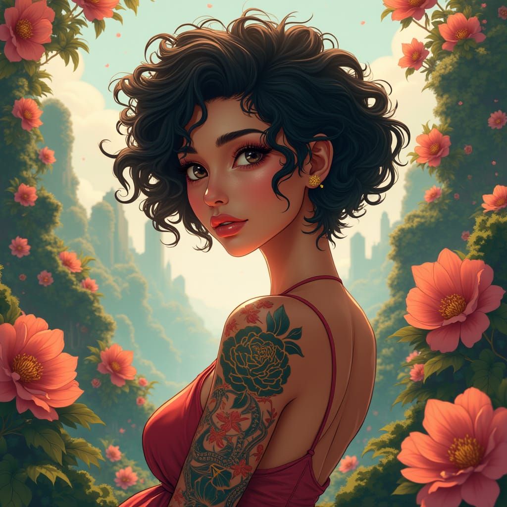 This image is a stunning fusion of futuristic and natural elements, featuring a beautiful Puerto Rican woman with short, curly hair and a mesmerizing tattoo sleeve, set against a rich, atmospheric backdrop, reminiscent of a cinematic film still.