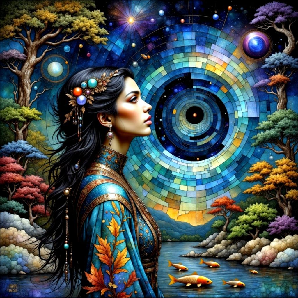 This image shows a close-up of a woman in a serene Japanese garden under a star-filled night sky. The scene is characterized by intricate, ethereal details and a blend of earthy and metallic tones.