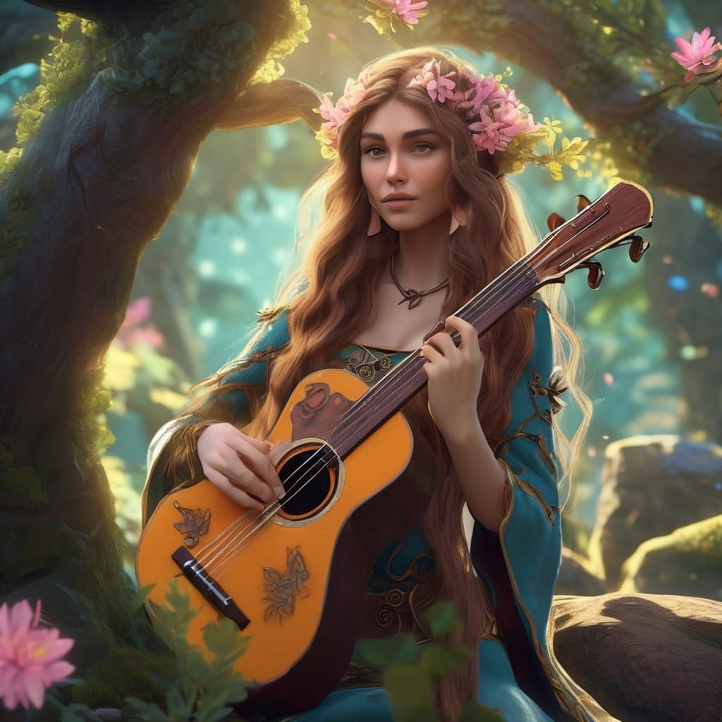 This image showcases a wood elf bard girl with long, flowery adorned hair playing music. The scene is a lush forest with glowing blossoms, rendered as detailed matte painting with rich, saturated colors.