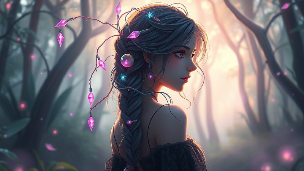 This image shows a young woman with an elaborate braid adorned with glowing threads and crystals, standing in an enchanted forest. The artwork features soft, ethereal lighting and pastel colors in an anime aesthetic.