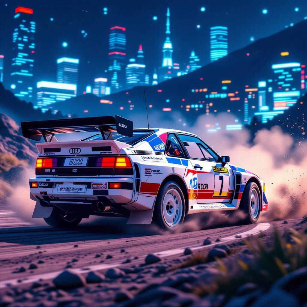This image shows an Audi Sport Quattro S1 Rally car drifting through a curve in the Argentinian steppes. The scene features a cyberpunk aesthetic with neon lighting and dynamic motion blur.