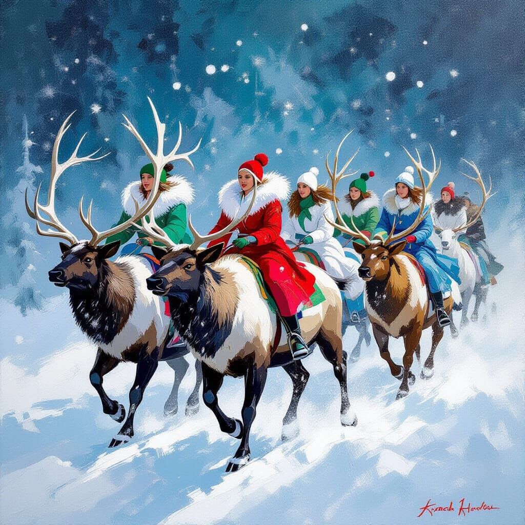 This image depicts abstract art of women in colorful attire riding elk through a snowstorm. Features dynamic lighting and textured brushwork inspired by abstract expressionism.