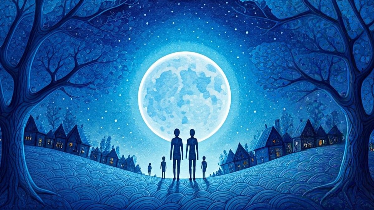 This image shows a completely blue world as a watercolor zentangle. Stick figures stand under a blue moon, surrounded by blue houses and trees in this calming scene.
