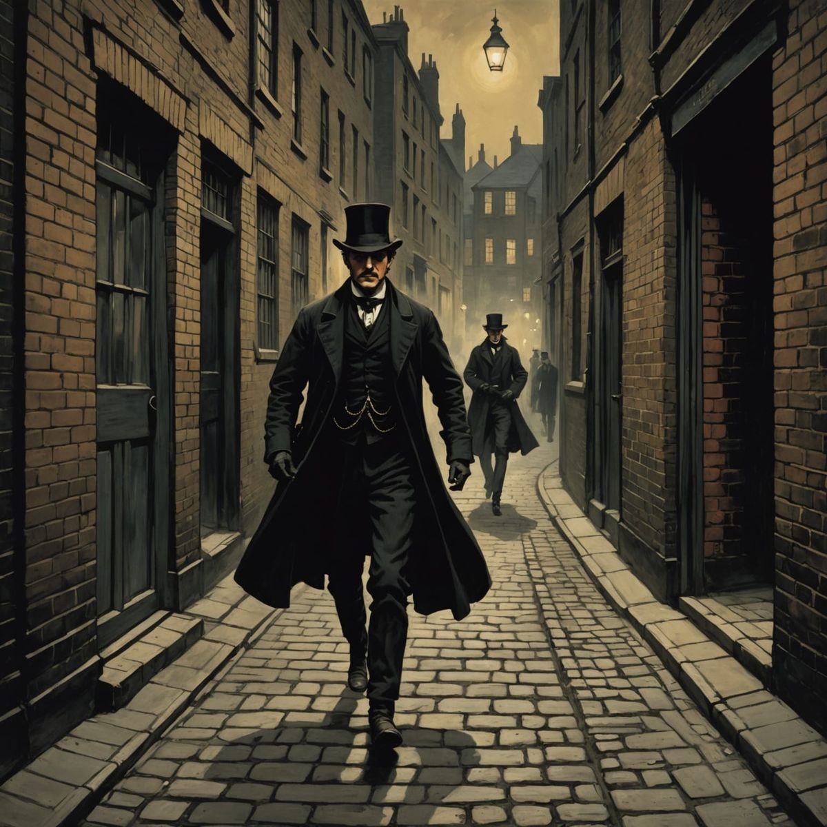 A dramatic oil painting of a chase through a dimly lit Victorian alleyway. The image shows a figure fleeing, pursued by another in the distance, painted in a dark, classical style.