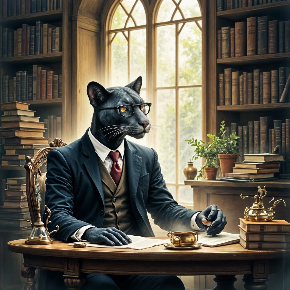 This image shows an anthropomorphic panther in a waistcoat and spectacles, contemplating books and instruments in a sunlit library. Rendered in a soft watercolor style, it evokes quiet intellectualism.