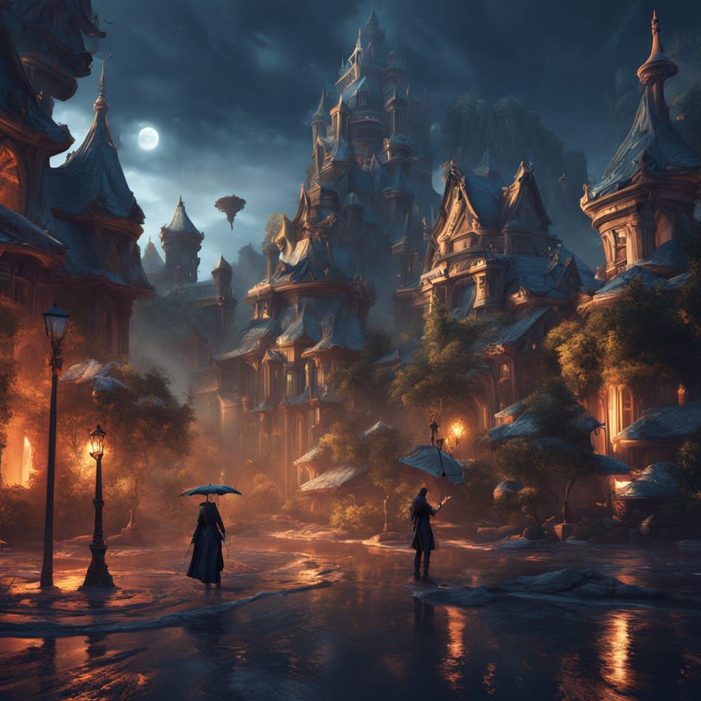 Generate your own romantic night city street images, glistening after rain. Free and easy AI art creation.