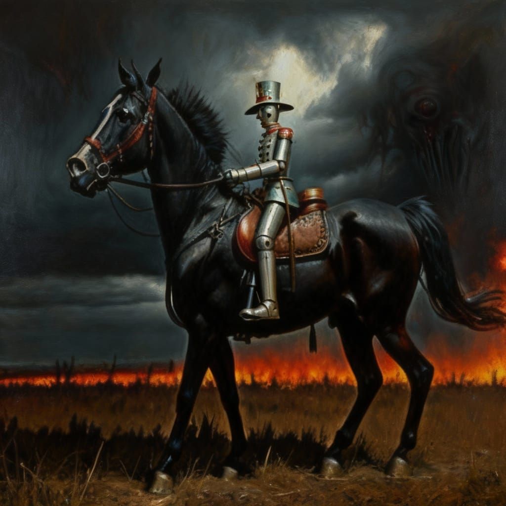 This concept art depicts a tin soldier riding away in a hyperdetailed, surrealist style reminiscent of Max Ernst. The oil on canvas texture lends an ominous, horror-like quality to the scene.