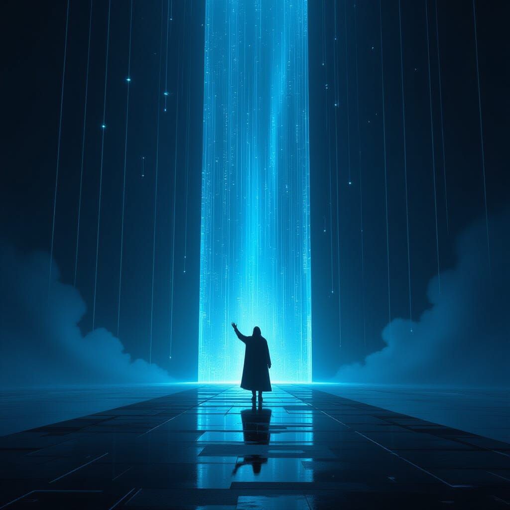 This digital matte painting shows a lone figure reaching towards a glowing gate in a dark, cosmic void. Iridescent light weaves through the scene, creating dramatic volumetric lighting.